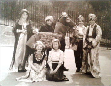 Front l-r: Donkey unknown (one half possibly Stephen Harding), Trevor Butcher, Susan